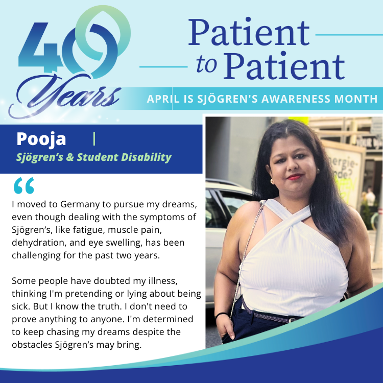 I was thrilled about moving to Europe to pursue my master's degree and start a new chapter in my life. Everything seemed perfect when I received my visa and acceptance from the university. However, my excitement turned into shock when I was diagnosed with Sjögren’s during a routine checkup just 15 days later. It felt like my world was falling apart. Despite feeling devastated, I decided to show my strength to my parents and myself. I moved to Germany to pursue my dreams, even though dealing with the symptoms of Sjögren’s, like fatigue, muscle pain, dehydration, and eye swelling, has been challenging for the past two years. Some people have doubted my illness, thinking I'm pretending or lying about being sick. But I know the truth. I don't need to prove anything to anyone. I'm determined to keep chasing my dreams despite the obstacles Sjögren’s may bring.